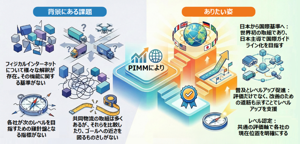 フィジカルインターネットモデルのプロセスを体系的、客観的に評価・改善し、物流プロセスの効率性・強靭性を向上させて持続可能な物流の実現に貢献する