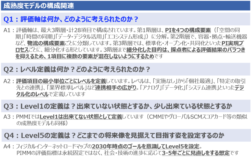 フィジカルインターネットプロセスの発展段階を5段階の成熟度レベルでモデル化したもの。グループ、企業等におけるフィジカルインターネットプロセスの状態を一定の基準で評価するための指標