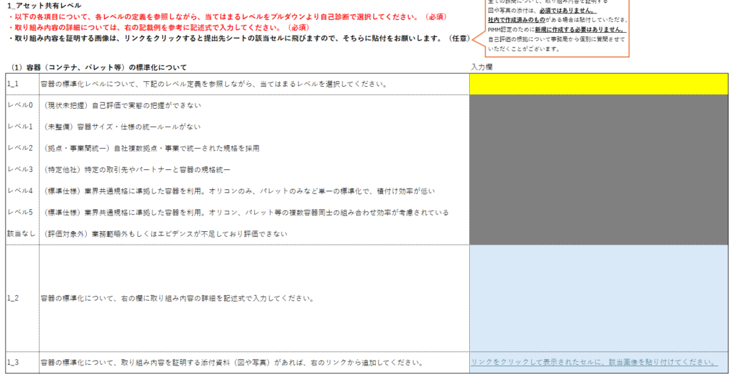 | 容器 (コンテナ・パレット) | 標準化 | (未整備) 容器サイズ・仕様統一のルールがない | (拠点・事業間統一) 自社複数拠点・事業で統一された規格を採用 | (特定他社) 特定の取引先やパートナーと容器の規格統一 | (標準仕様) 業界共通規格に準拠した容器を利用 単一(オリコンのみ、パレットのみ)の標準化であり、積付け効率が低い | (標準仕様) 業界共通規格に準拠した容器を利用 オリコン・パレット等の複数の容器同士の組合せ効率が考慮されている |